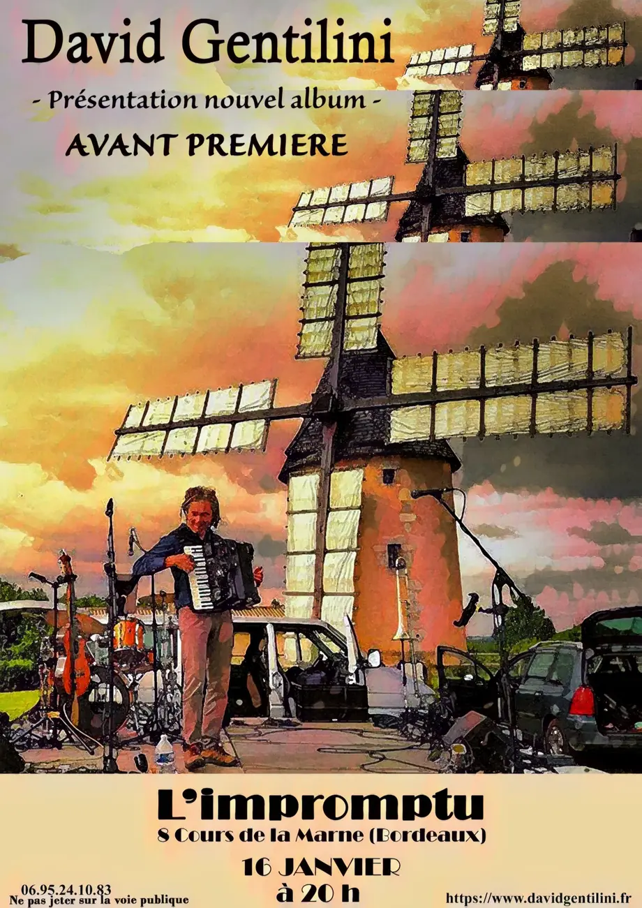 Auteur, compositeur, interprète, multi-instrumentiste (chant, guitare, accordéon), David Gentilini vous présente en avant première les chansons de son nouvel album "Au passage des sons", sortie prévue Printemps 2026, dans le cadre intimiste et chaleureux de l'impromptu.