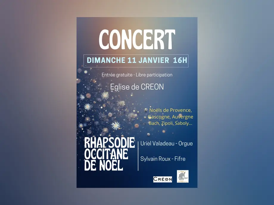 L’association des Amis de l’Orgue de Créon vous invite au concert « Rhapsodie Occitane de Noël » à l’église Notre-Dame de Créon.