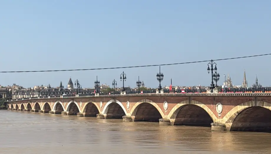 Construit entre 1810 et 1822 sur ordre de Napoléon Ier, le pont de Pierre est le premier pont de Bordeaux à enjamber la Garonne. Ses 17 arches en briques rouges relient la porte de Bourgogne au quartier de la Bastide sur 487 mètres. Classé monument historique depuis 2002, c'est aujourd'hui une promenade incontournable pour piétons et cyclistes bordelais.