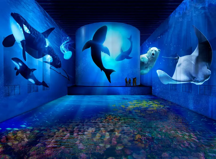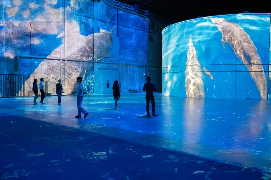 Des personnes observent des projections de vie marine, notamment des baleines, un ours polaire et une raie manta, dans une exposition aquatique immersive.