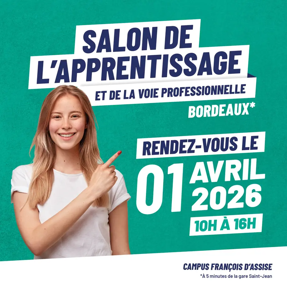 Ne manquez pas cette opportunité ! Venez découvrir le Salon de l’Apprentissage au Campus François d’Assise à Bordeaux. Après le succès de notre troisième édition en 2025, qui a accueilli plus de 400 visiteurs, nous vous donnons à nouveau rendez-vous mercredi 1 avril 2026.