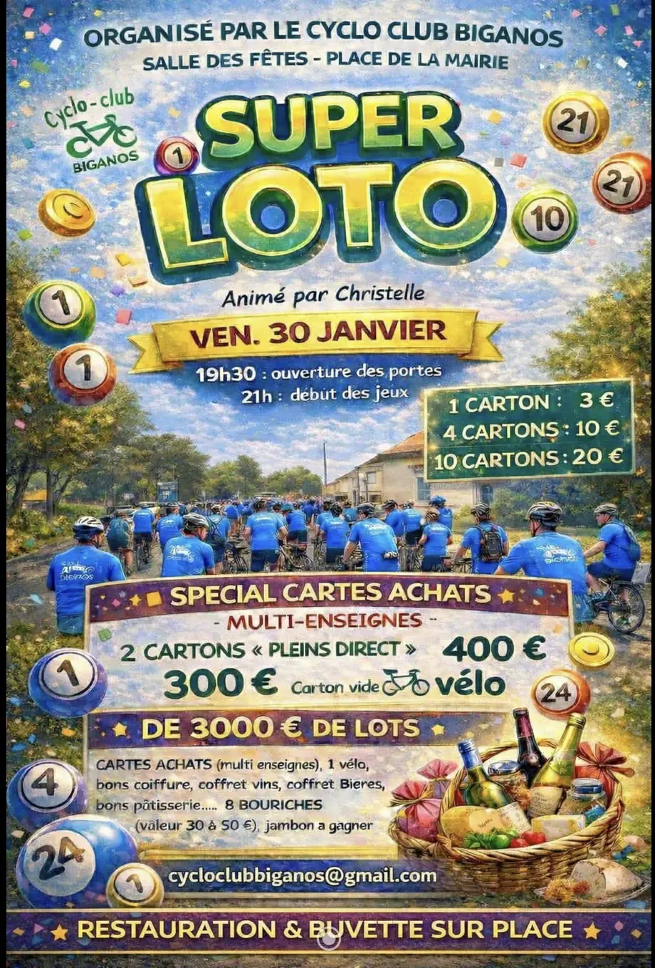 LotoLe 01/03/2026 ArèsLoto avec de nombreux lots, dont des bons d’achat de 100 €, 150 € et 200 €. Stand de pâtisseries et de boissons.