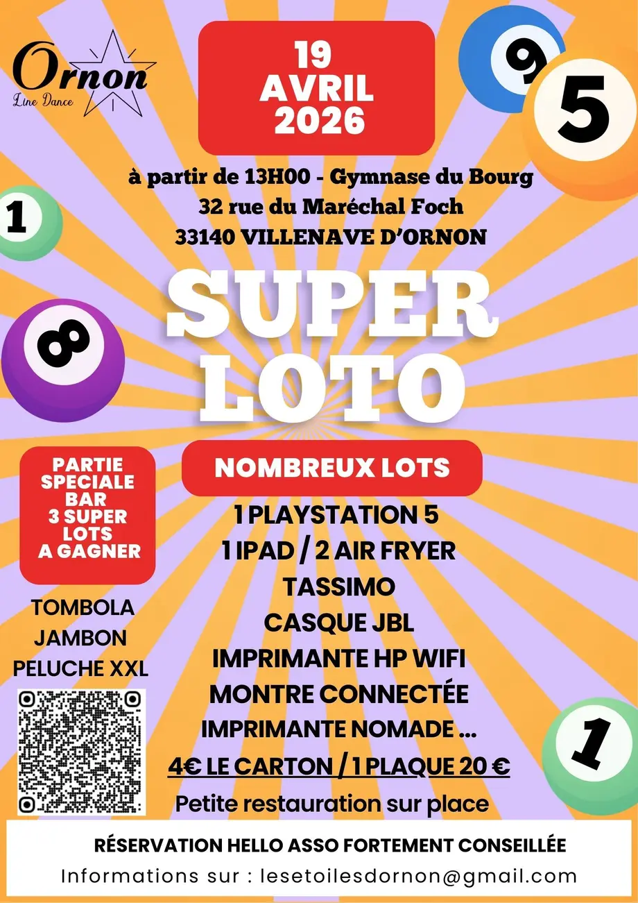 SUPER LOTO des ETOILES D 'ORNON le dimanche 19 Avril 26 au Gymnase du Bourg Réservation fortement conseillée Places limitées. Premiers inscrits premiers servis. Merci de bien vouloir inscrire TOUS les participants Restauration sur place Ouverture des portes 13h00 SUPER LOTO des ETOILES D 'ORNON le dimanche 19 Avril 26 au Gymnase du Bourg.