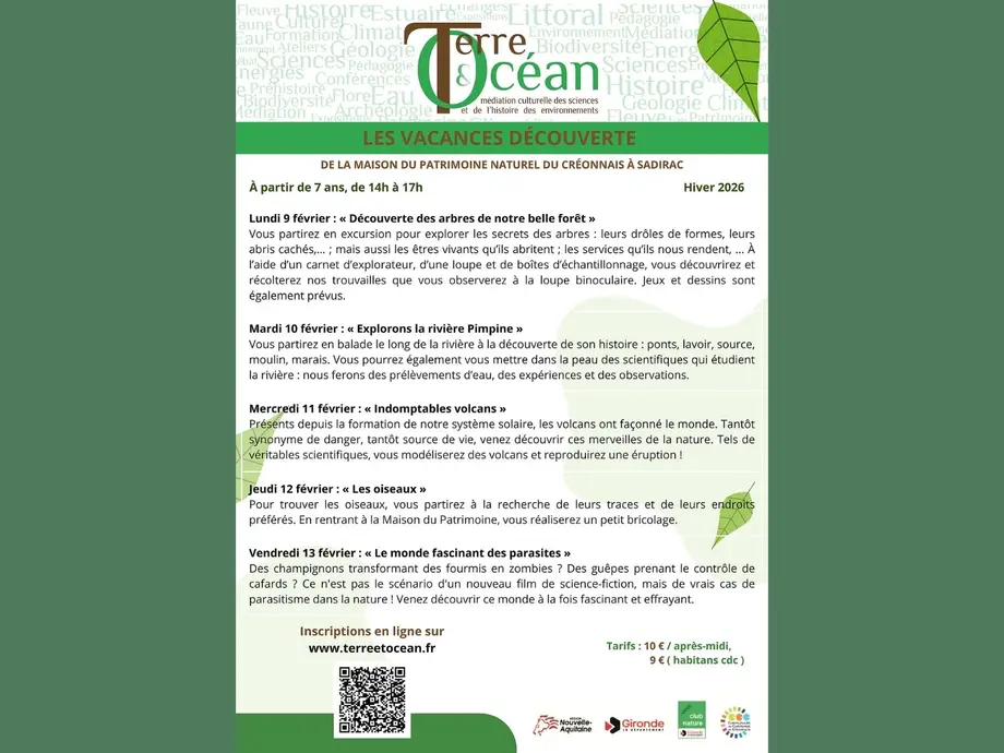 Ateliers, balades, bricolages et jeux autour de la nature, tous les après-midis de la première semaine des vacances de février, de 14 h à 17 h (du 9 au 13 février).