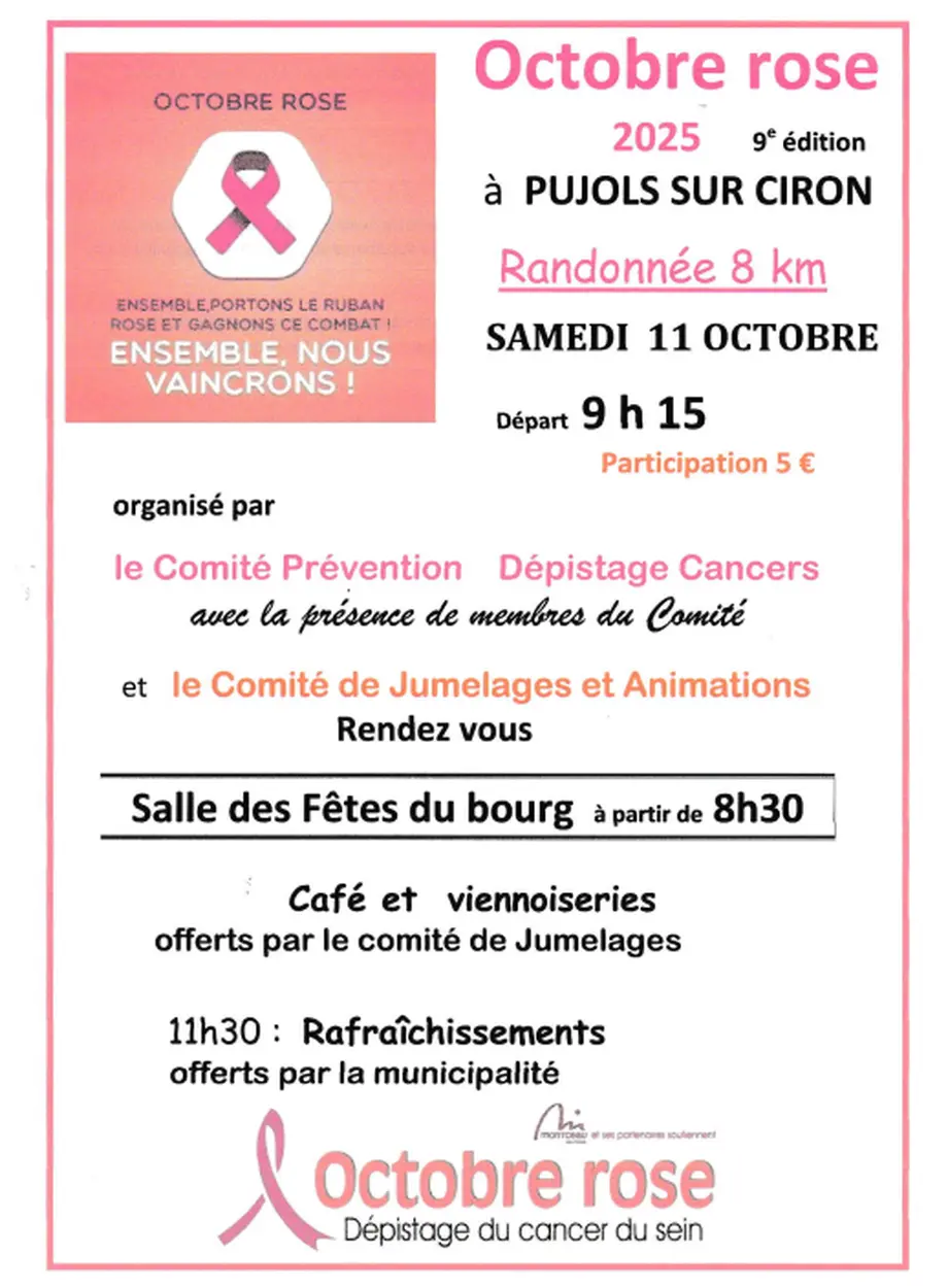 Une randonnée de 8 km « Château de Bommes » est organisée par le Comité Prévention Dépistage Cancer, le Comité de Jumelages et d’Animation et la municipalité de Pujols-sur-Ciron.