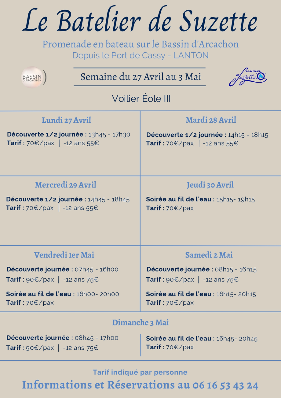 Passe Marée "L'intégrale"Du 21/04/2026 au 31/07/2026Andernos-les-BainsLe Passe Marée vous propose de partir pour une journée en bateau sur le bassin d'Arcachon afin de découvrir les incontournables :