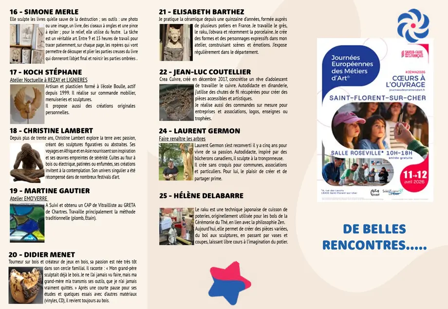 Les 11 et 12 avril 2026, la Salle Roseville à Saint-Florent-sur-Cher accueille les Journées Européennes des Métiers d’Art, organisées par la Ville en partenariat avec l’artisan CREA CUIVRE.
