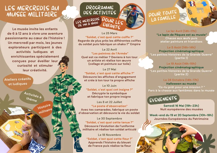 Le Musée du Train et des équipages militaires propose aux enfants de 6 à 12 ans un atelier créatif autour des coiffes militaires. Après avoir observé de près les différents couvre-chefs portés par les soldats à travers l’histoire, les participants réaliseront leur propre shako du Premier Empire. Une activité ludique et pédagogique pour mieux comprendre l’uniforme militaire tout en développant leur créativité.