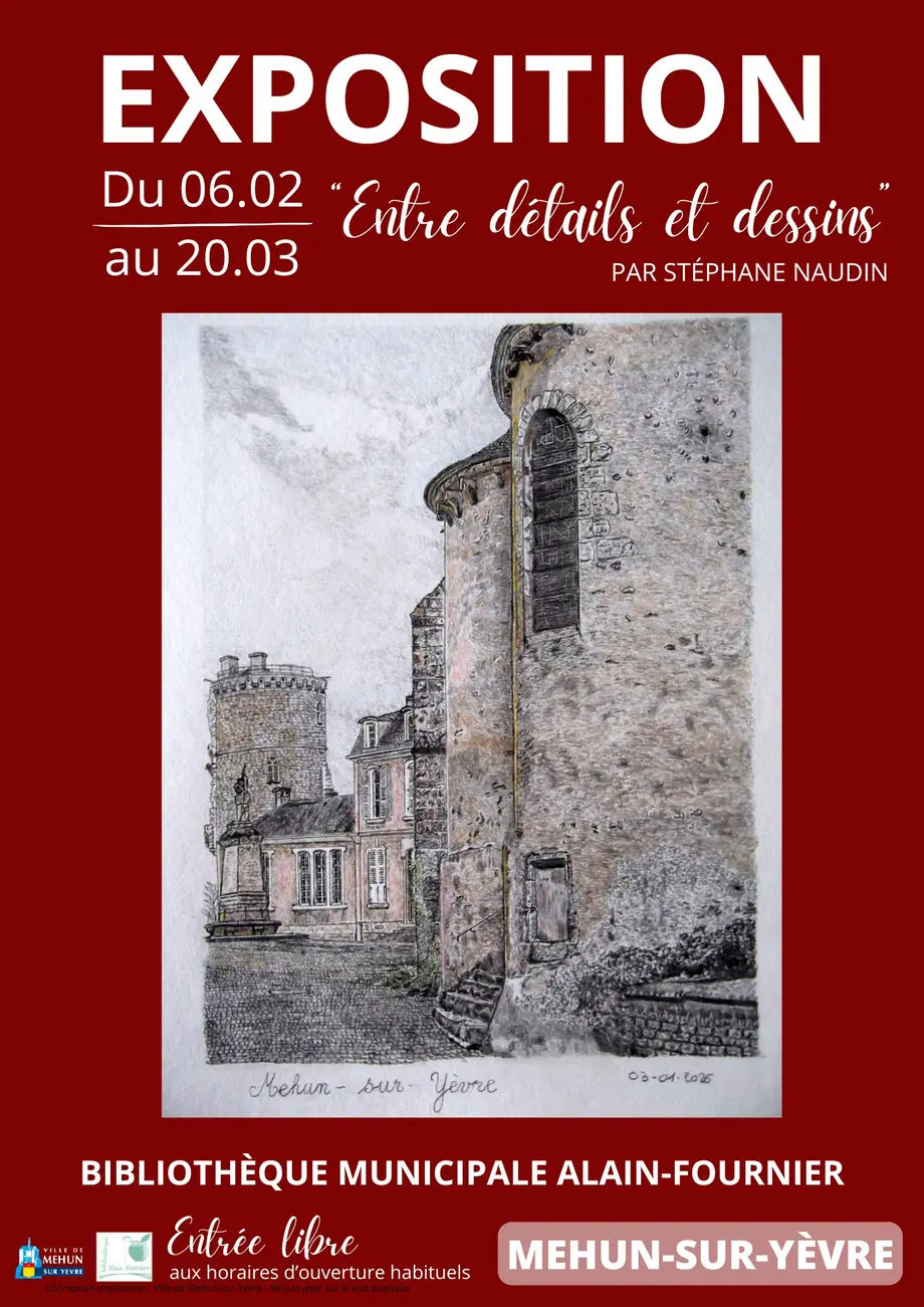 La Bibliothèque municipale Alain-Fournier de Mehun-sur-Yèvre accueille l’exposition Entre détails et dessins de Stéphane Naudin.