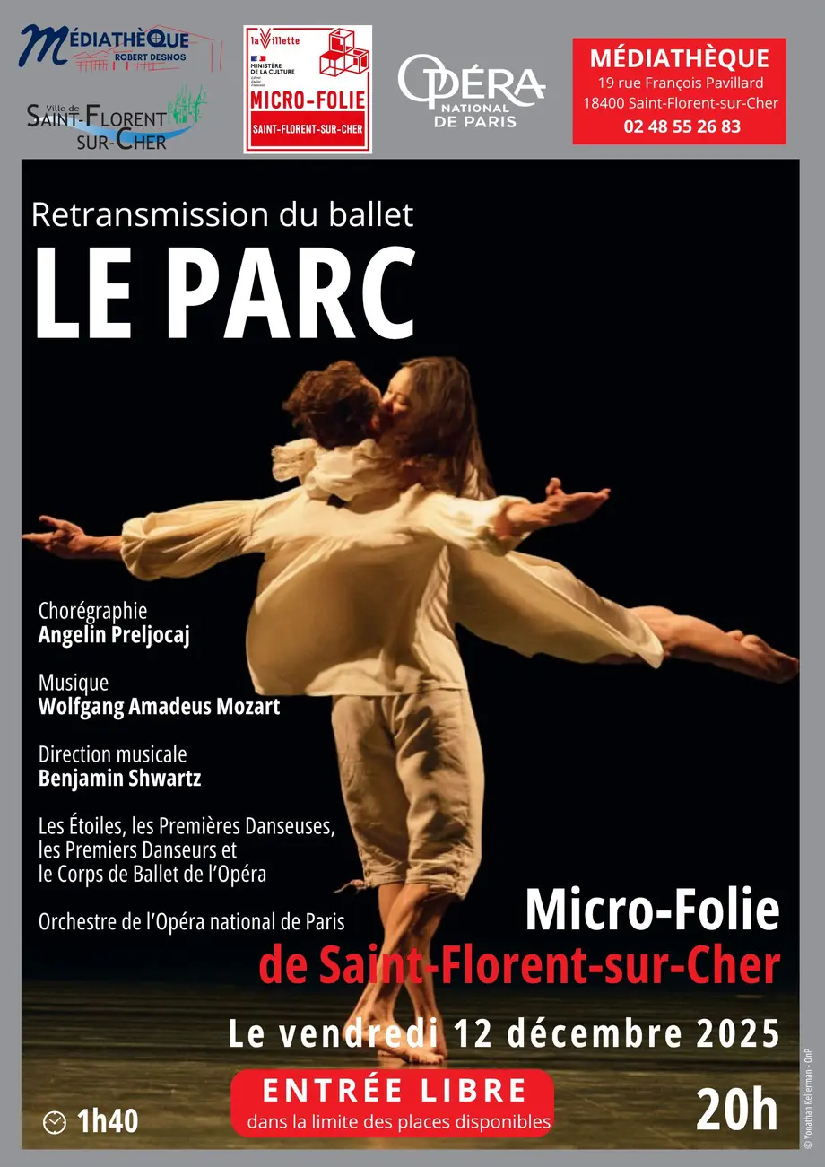 Le musée numérique de Saint-Florent-sur- Cher vous accueille le vendredi 12 décembre pour une retransmission de la captation du ballet Le Parc , chorégraphié par Angelin Preljocaj sur la musique de Mozart. Créé en 1994, Le Parc explore les jeux de l'amour à travers une chorégraphie mêlant classicisme et modernité. Porté par la musique de Mozart et une mise en scène raffinée, ce ballet est devenu une œuvre emblématique, dont le célèbre pas de deux final marque les esprits.