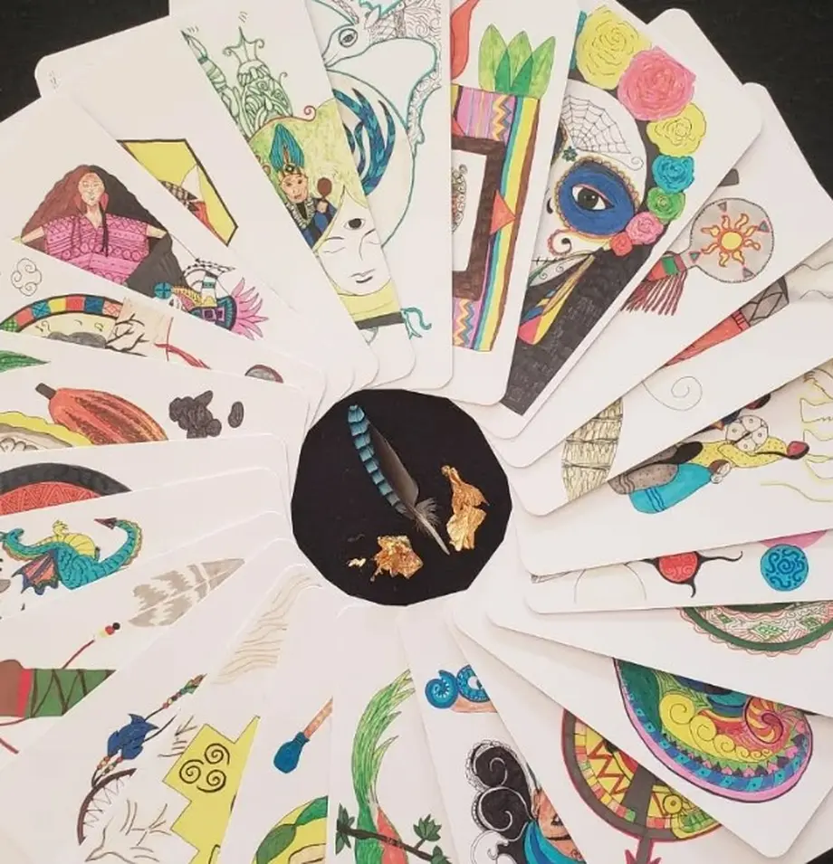 L’exposition présente des peintures originales, des cartes imprimées et des tissages traditionnels appelés Ojos de Dios.