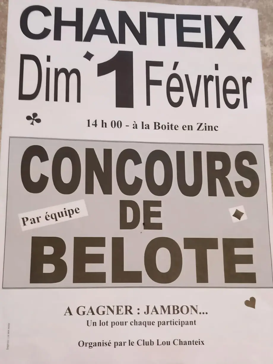 Concours de belote en équipeLe 31/01/2026 Le PescherL’APE Les Écoliers de la Sourdoire organise un concours de belote en équipe.