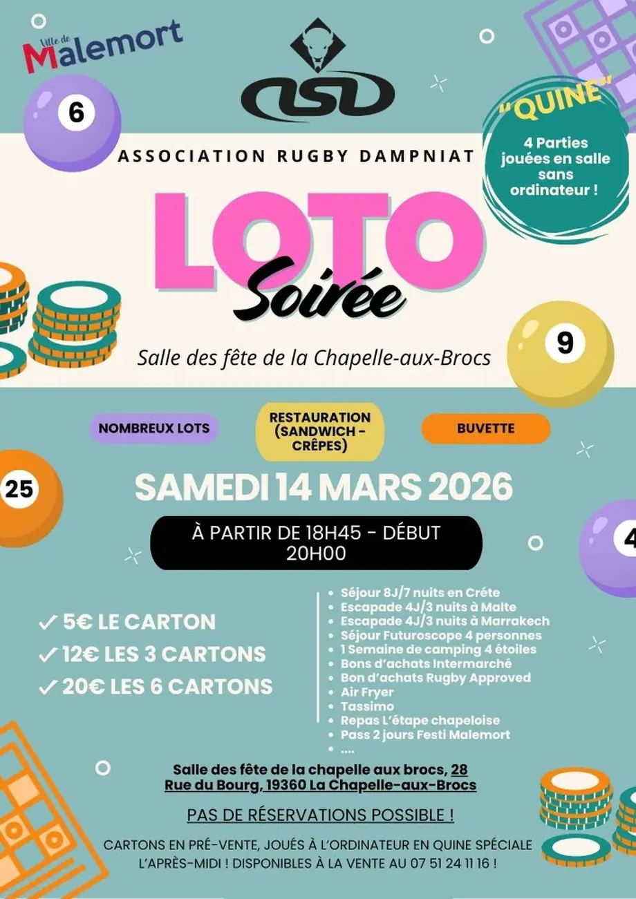 Soirée organisée par l'association de rugby de Dampniat, avec de nombreux lots à gagner.