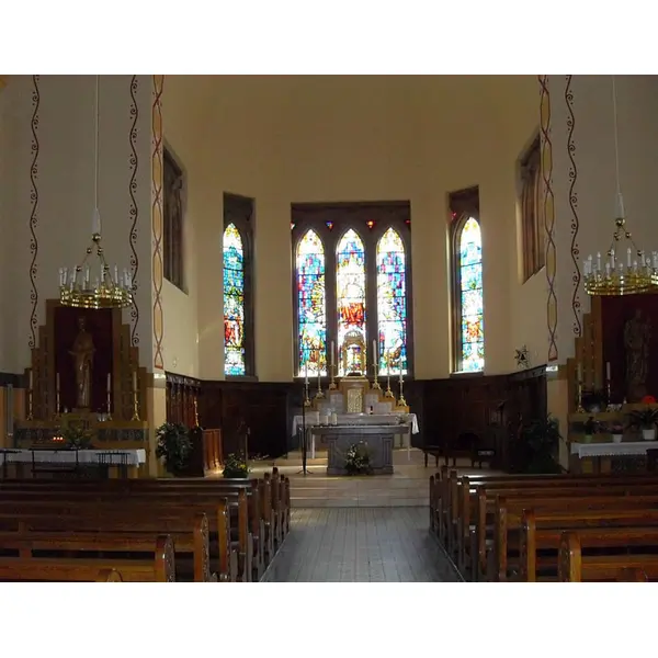 À l'intérieur de l'église, on note la présence de vitraux colorés qui encadrent le chœur où se trouve l'autel. Ces vitraux proviennent de l'atelier Ott Frères de Strasbourg.
