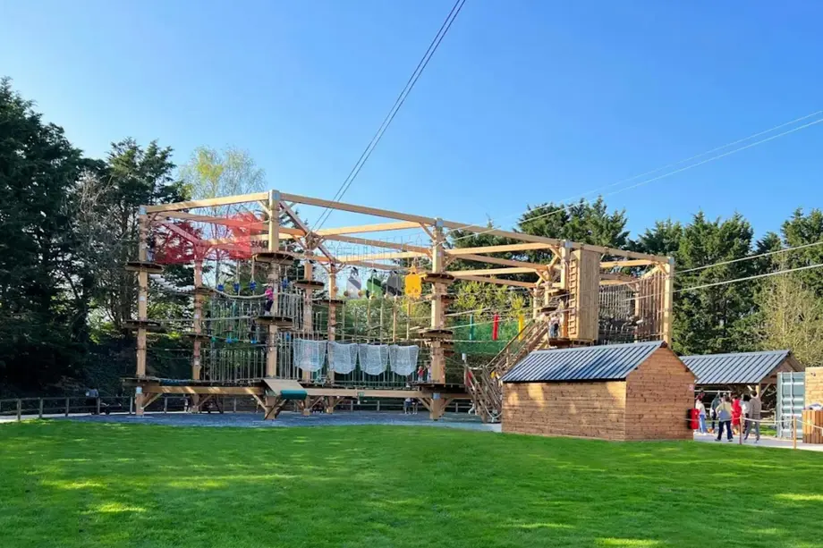 Parcours d'aventure en plein air avec des plateformes en bois, des cordes, des filets, des tyroliennes et une petite cabane en bois ; entouré d'herbe et d'arbres.