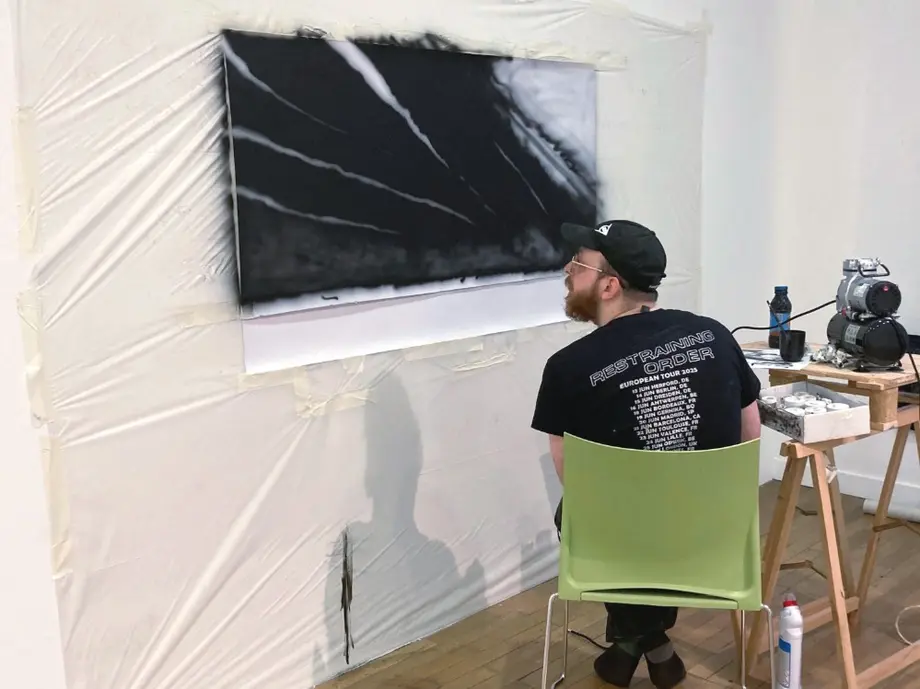 Son travail est habité par des spectres. Ils prennent la forme de figures anonymes, parfois masquées, figées dans des postures d’attente, arborant des signes d’appartenance souterraine, ou encore de traits abstraits et ectoplasmiques, qui viennent parasiter les images et composent un univers entre le tag et le logo de métal.
