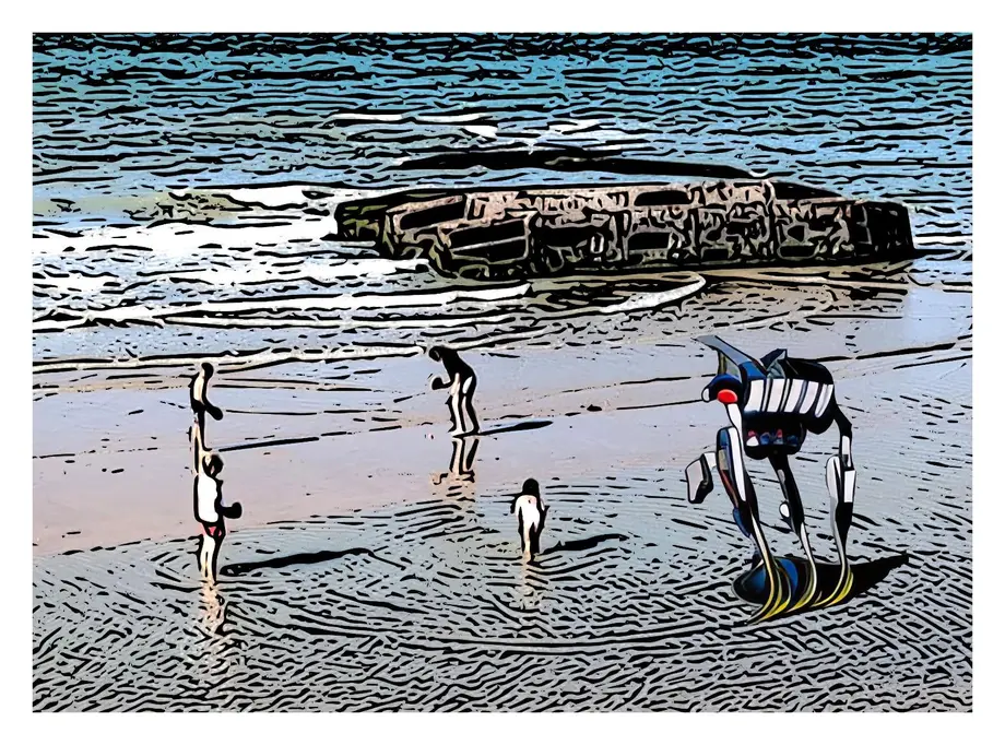 Ainsi, des machines volantes planent au-dessus de la côte, transformant le ciel en territoire d'anticipation. Plus loin, le musée 360 d'Arromanches se métamorphose en observatoire sous dôme, comme un poste avancé scrutant les possibles. Sur la plage enfin, entre vestiges du Débarquement et silhouettes de baigneurs, un robot s'avance parmi les humains, présence incongrue qui questionne l'avenir de notre cohabitation avec la technologie.
