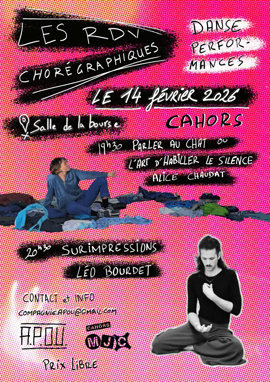 La compagnie A.P.O.U. ouvre un cycle de rendez-vous chorégraphiques en partenariat avec la MJC de Cahors. « L’idée : entrer dans l’univers d’un·e danseur·euse-chorégraphe au cœur de son processus de création. » Ces rendez-vous sont l’occasion pour un·e artiste de tester un travail en cours. Il peut s’agir des prémices d’une création, d’un extrait ou de la totalité d’une pièce en cours d’élaboration.