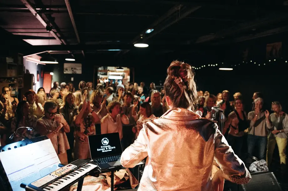 Marie So, chanteuse et cheffe de chœur, te guide pour chanter deux morceaux revisités en français et/ou en anglais. Facile et ludique : les paroles s’affichent sur un écran géant, avec des repères adaptés pour chaque voix ! Le final ? Tu chantes la version complète, entouré de tous les participants, sous la direction de Marie So, accompagné de Chris à la guitare et d’une bande-son basse-batterie !