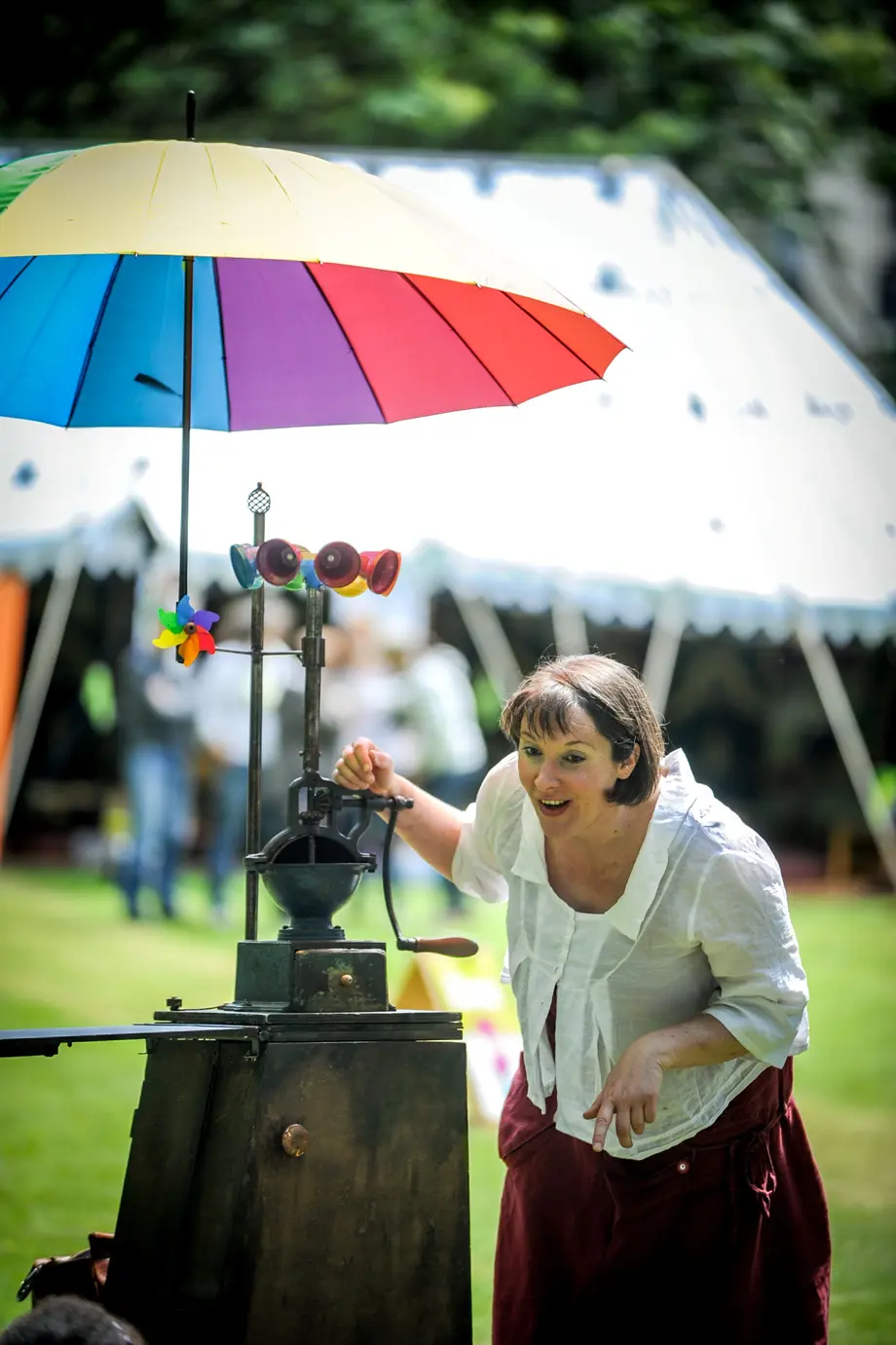Cécile Pérus installe son moulin sous le chapiteau du festival pour réveiller les paires d’oreilles des plus jeunes en ce samedi matin. Trois tours de manivelle dans le double sens des mots, et une idée colorée sort du tiroir.