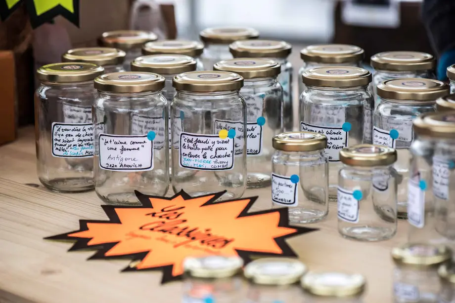 Entre le stand du fromager, celui des légumes et de la charcuterie artisanale, découvrez « La Conserverie Théâtrale » et ses paroles théâtrales… en bocaux !