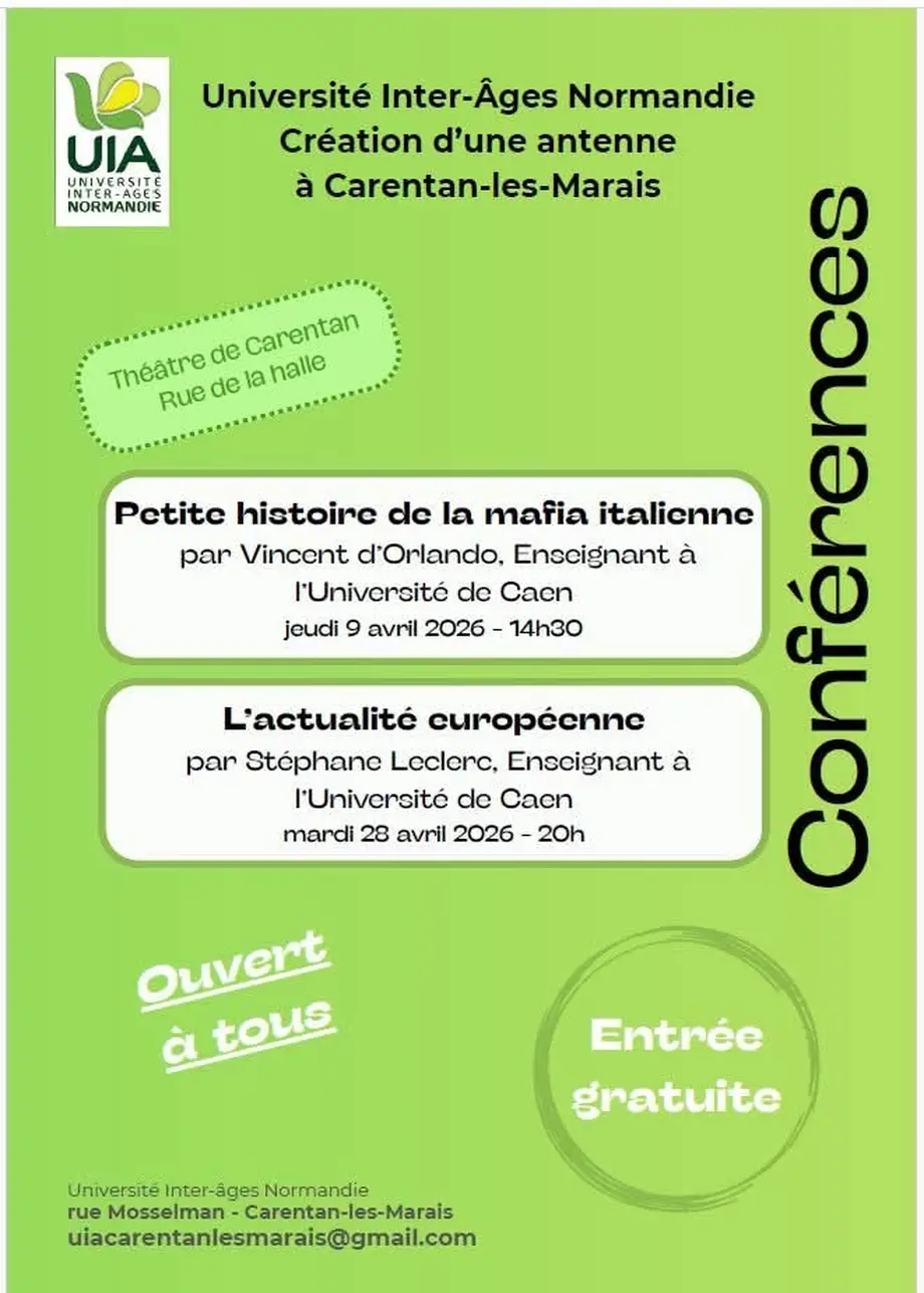 ConférenceLe 09/04/2026Carentan-les-MaraisPetite histoire de la mafia italienne, par Vincent d'Orlando, enseignant à l'Université de Caen.