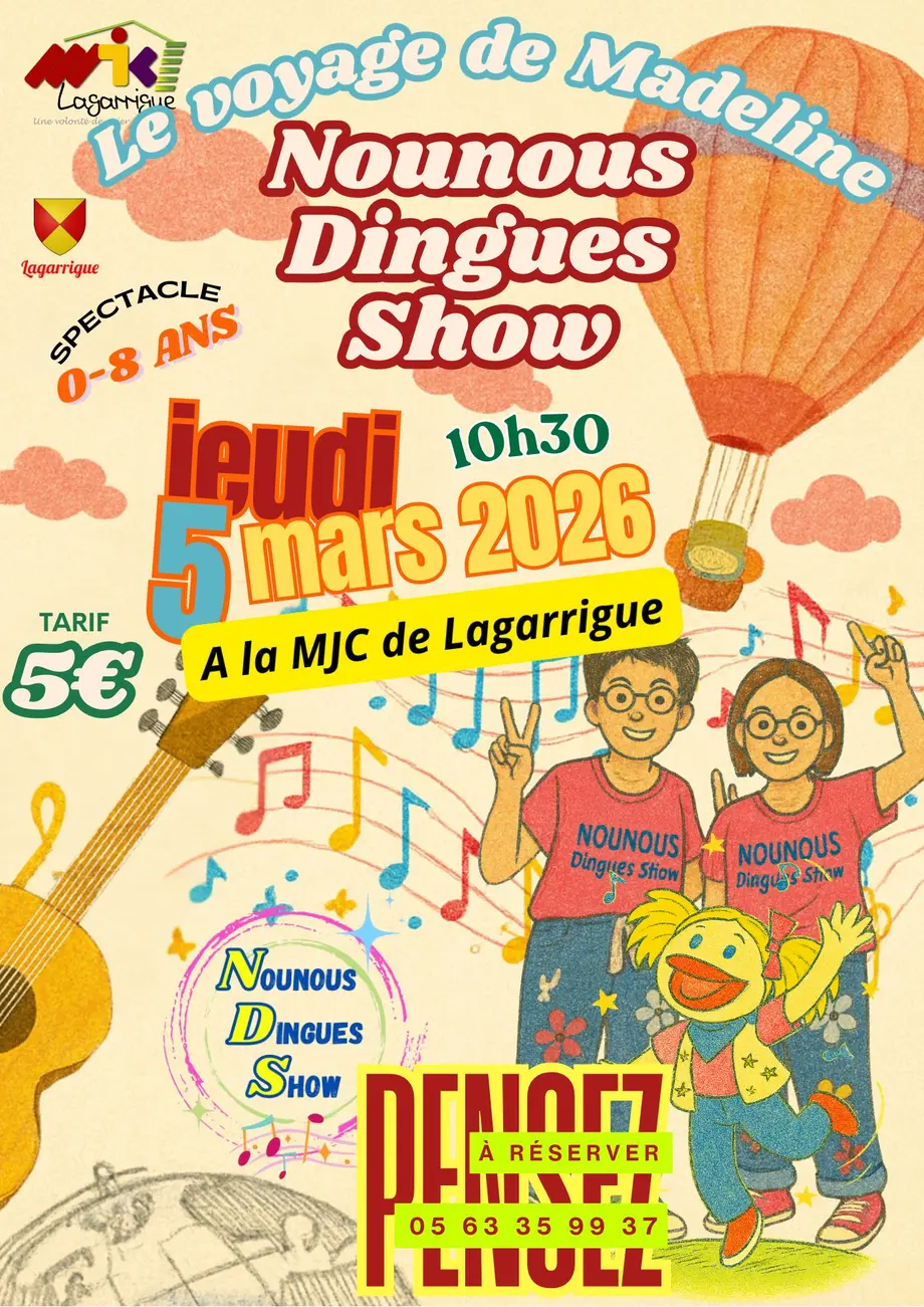Avis aux petits aventuriers ! Le Nounous Dingues Show revient avec Le Voyage de Madeline, un spectacle musical participatif rempli de rires, de chansons et de surprises. Deux nounous un peu déjantées et une marionnette malicieuse embarquent les enfants pour un moment interactif, joyeux et plein d’énergie !