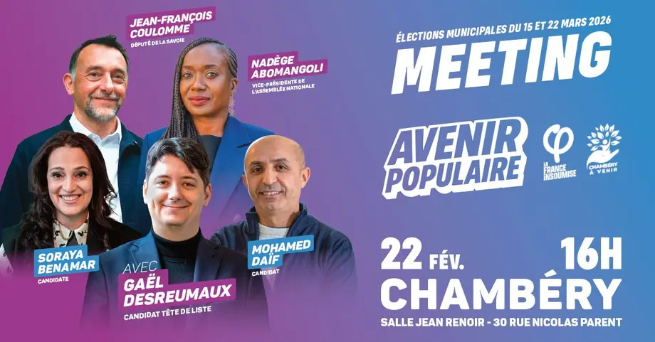 La liste Avenir Populaire, issue du rassemblement entre La France Insoumise et Chambéry à Venir, dans le cadre des élections municipales des 15 et 22 mars 2026, annonce la tenue de sa deuxième réunion publique. Cet événement se déroulera le 22 février 2026 à 16h à la Salle Jean Renoir, en présence de Nadège Abomangoli, vice-présidente de l’Assemblée nationale.