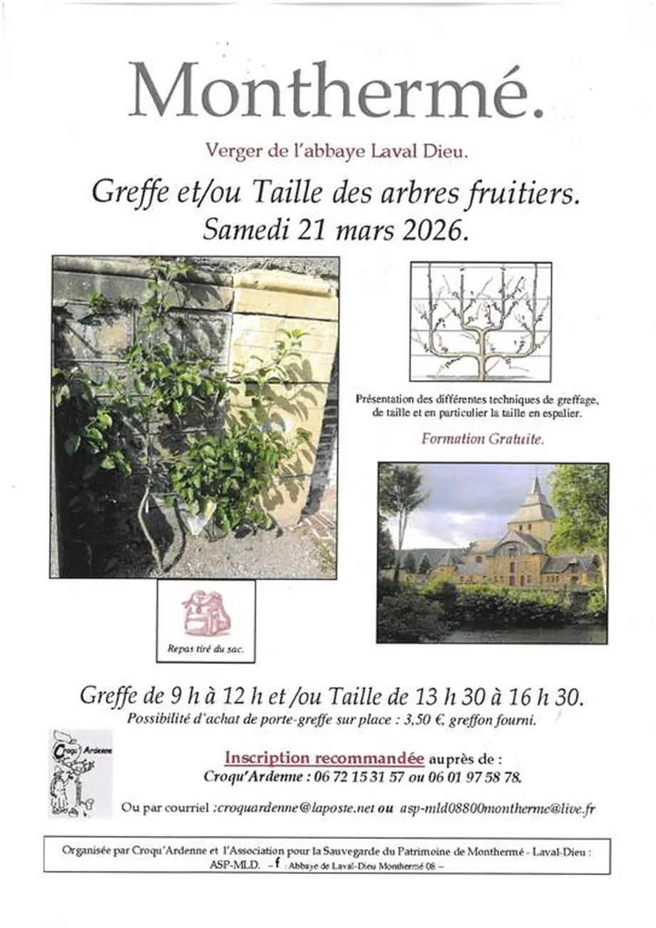 Samedi 21 mars, de 9 h à 12 h pour la greffe et/ou de 13 h 30 à 16 h 30 pour la taille, au verger de l'abbaye de Laval-Dieu.
