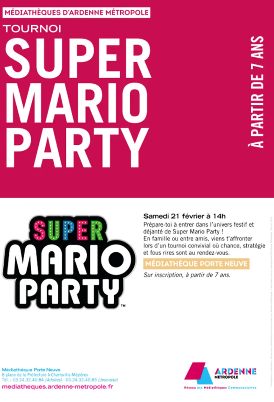 Prépare-toi à entrer dans l’univers festif et déjanté de Super Mario Party ! En famille ou entre amis, viens te mesurer aux autres lors d’un tournoi convivial où chance, stratégie et fous rires sont au rendez-vous. Conditions d’accès sur inscription, à partir de 7 ans.