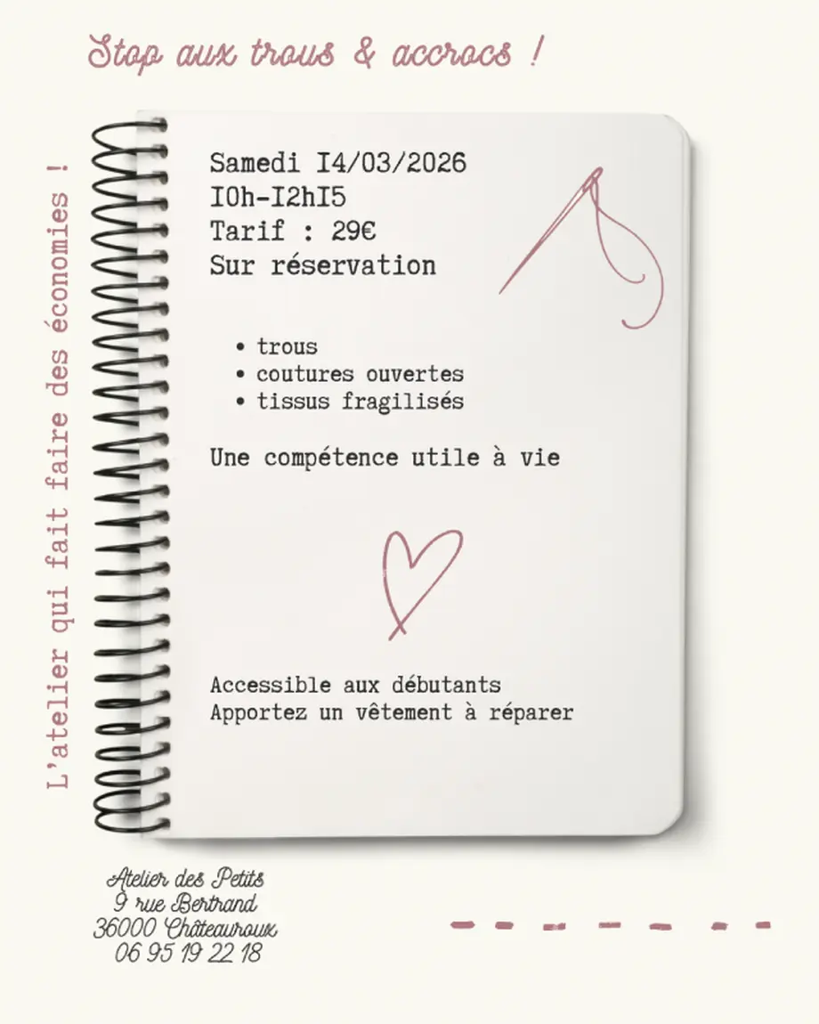 Projet Libre : Cours de coutureJusqu'au 30/04/2026ChâteaurouxDurée de l’atelier : 2 h 15