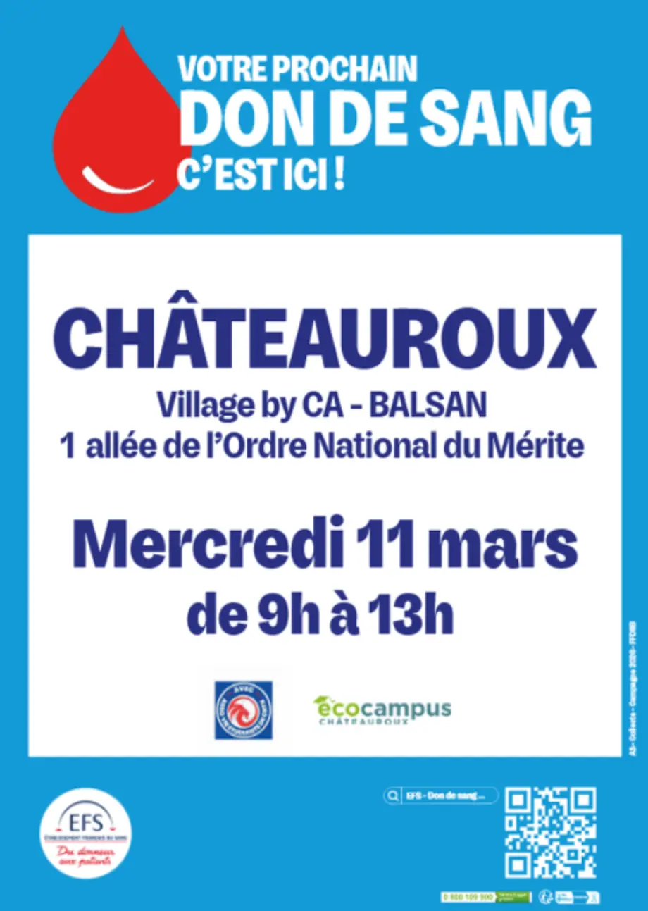Venez nombreux le mercredi 11 mars, de 9 h à 13 h, au Village by CA (Balsan, le bâtiment avec l’horloge), à Châteauroux. La collecte se fait sur rendez-vous ! Pensez à réserver votre créneau en ligne.