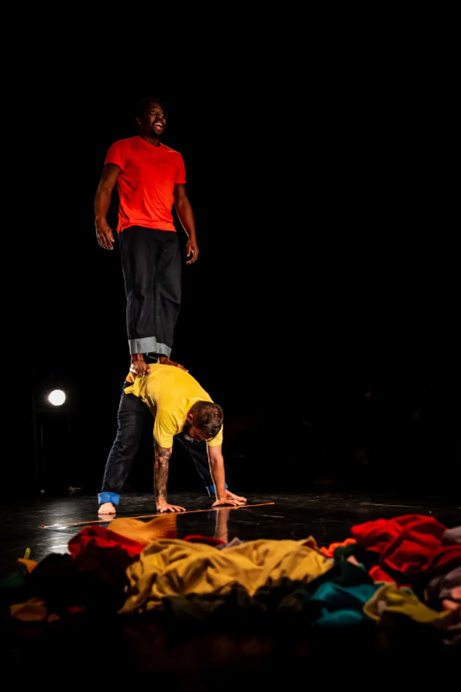 Il danse sur et autour d’un cube de bois, tandis que l’autre démonte le sien, qui en contient des dizaines de petits… Sommes-nous dans une cour d’école, dans un bac à sable, sur une scène de théâtre ?