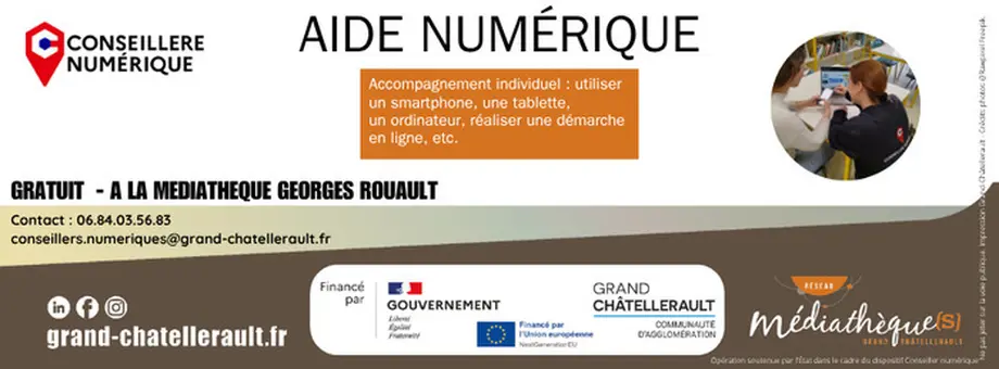 Une conseillère numérique de Grand Châtellerault vous apporte une aide personnalisée dans l'usage de vos outils numériques afin de vous faire acquérir l'autonomie nécessaire face à vos besoins quotidiens.