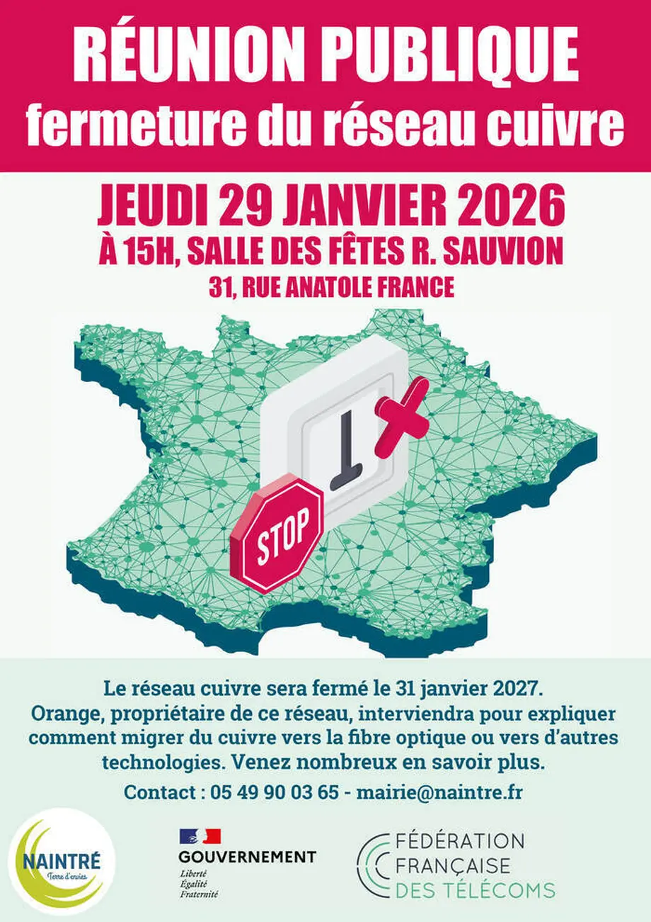 Orange, propriétaire du réseau cuivre, organise une réunion pour vous expliquer comment migrer vers la fibre optique ou d'autres technologies le jeudi 29 janvier à 15 h à la salle des fêtes de Naintré.