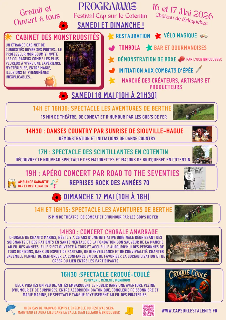 En cas de mauvais temps, le festival se déroulera dans la salle Jean Elliard à Bricquebec.