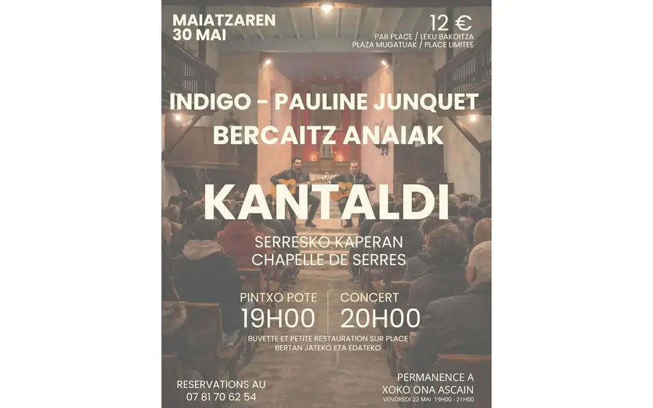 Un pintxo pote sera proposé sur place dès 19h (pintxo, talo, frites, boissons) et les portes de la chapelle s'ouvriront à 20h pour le concert.