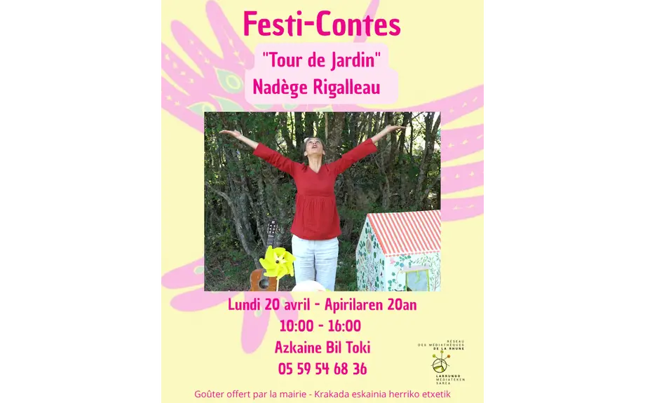 Dans le cadre du festival Festi-Contes, qui se déroule dans toutes les médiathèques du réseau de La Rhune, Nadège Rigalleau propose un spectacle tout en douceur pour les tout-petits : un simple tour de jardin.