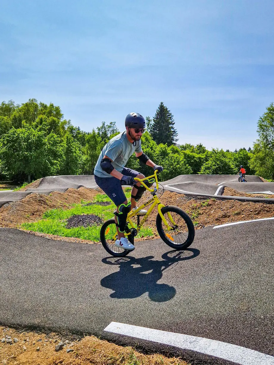Une personne utilise un vélo BMX jaune sur une piste de pompage dans un parc ensoleillé, en portant un casque et un équipement de protection.