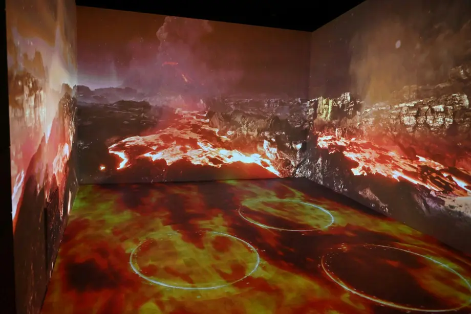 Une pièce dont les murs et le sol affichent une projection d'un paysage volcanique enflammé avec de la lave et de la fumée.