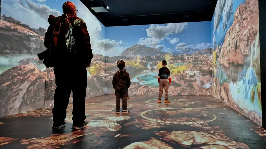 Trois personnes, dont deux enfants, se trouvent dans une pièce où un paysage désertique détaillé est projeté sur les murs et le sol.