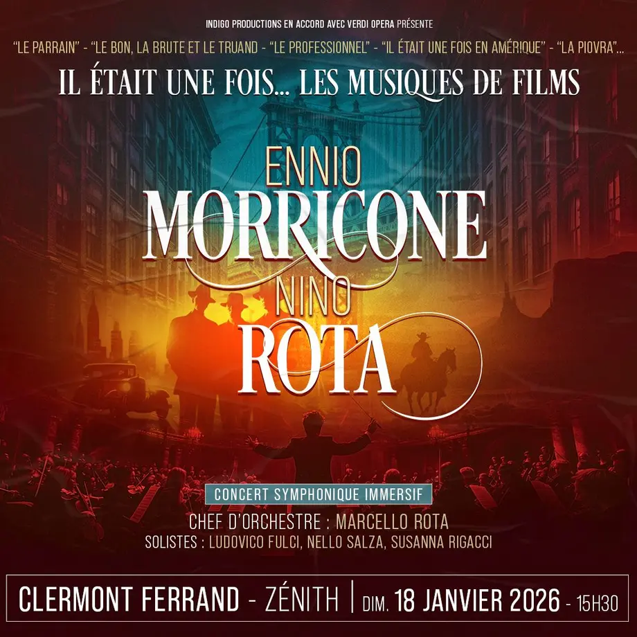 Sous la direction de Marcello Rota, chef d'orchestre de renommée internationale et neveu de Nino Rota, les célèbres solistes Nello Salza (trompette), Ludovico Fulci (piano) et Susanna Rigacci (soprano), qui ont collaboré pendant plus de 30 ans avec Ennio Morricone avec plus de 500 concerts à travers le monde, interprètent des pièces magistrales du répertoire. Vivez les moments clés de leurs carrières exceptionnelles à travers les musiques de films de Sergio Leone (Le Bon, la Brute et le Truand, Il était une fois dans l'Ouest…), Francis Ford Coppola (Le Parrain…) ou encore Federico Fellini (La Strada).