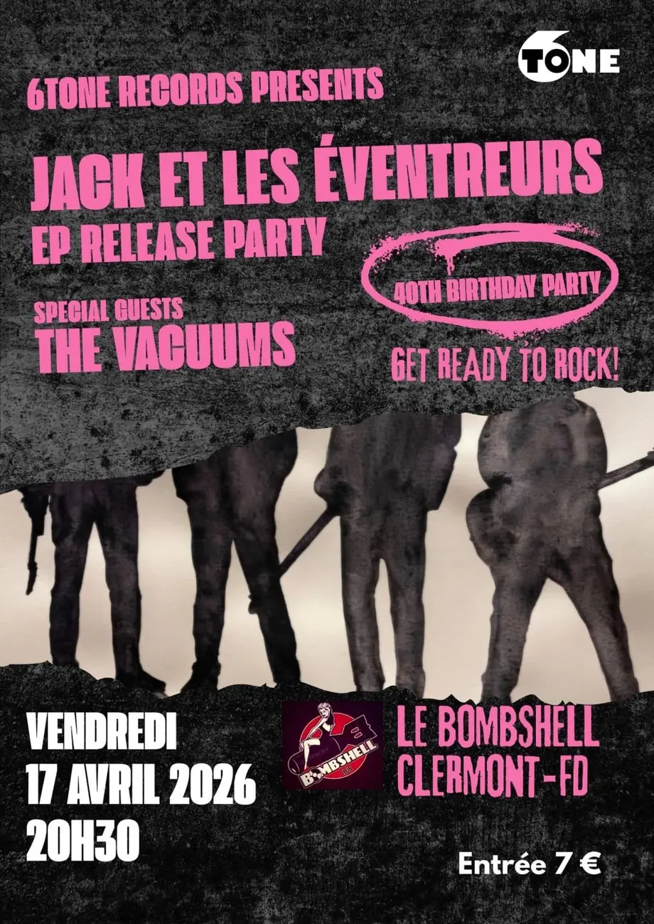 Release Party pour le EP de Jack et Les Éventreurs (rock'roll / garage Clermont fd) sur le label 6 Tone Records qui fétent aussi les 40 ans de la formation du groupe + The Vacuums (Toulouse, Garage rock psychédélique) qui viennnent de sortir leur 1er Lp sur les labels 6 Tone records et Strychnine records