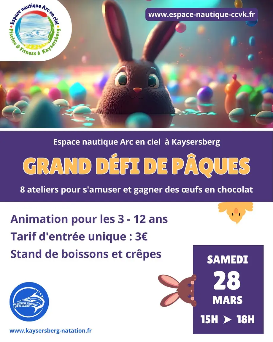 L'Espace nautique Arc en ciel à Kaysersberg et le club Kaysersberg Natation proposent le Grand Défi de Pâques à la piscine : 8 ateliers pour s'amuser dans l'eau.