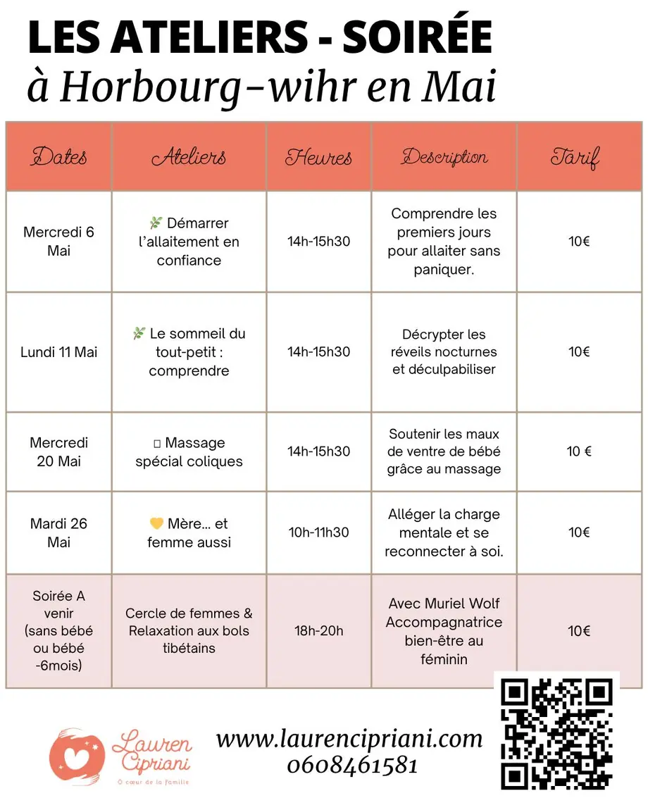 Je propose des ateliers qui changent chaque mois à Horbourg-wihr : sommeil bébé, allaitement, massage bébé (spécial coliques), ainsi que des cercles de femmes et des temps de relaxation (bols tibétains, bain sonore)...