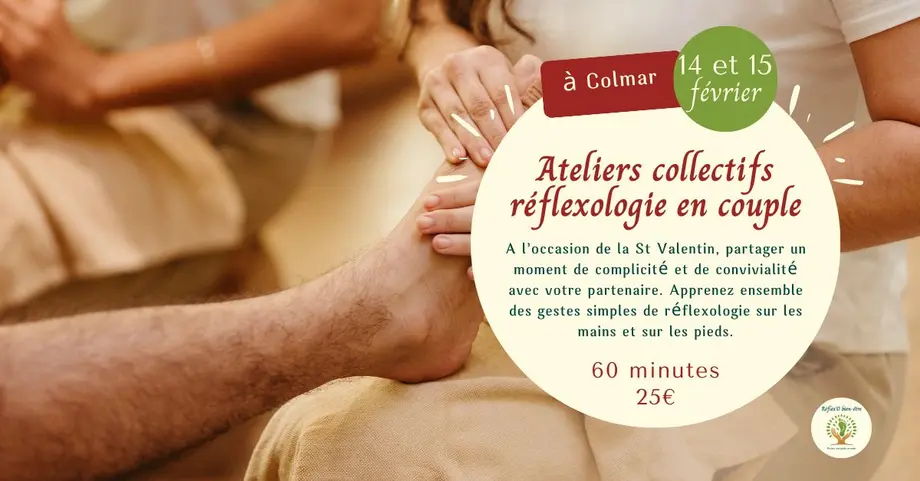 Les ateliers, animés par Ludivine Philippe, réflexologue certifiée, ont lieu au cabinet Reflex'O Bien-etre, 12 Place du Capitaine Dreyfus a Colmar (3ème étage, a gauche après l’ascenseur). Tarif : 25 euros par couple. Réservation obligatoire. Tenue confortable recommandée.