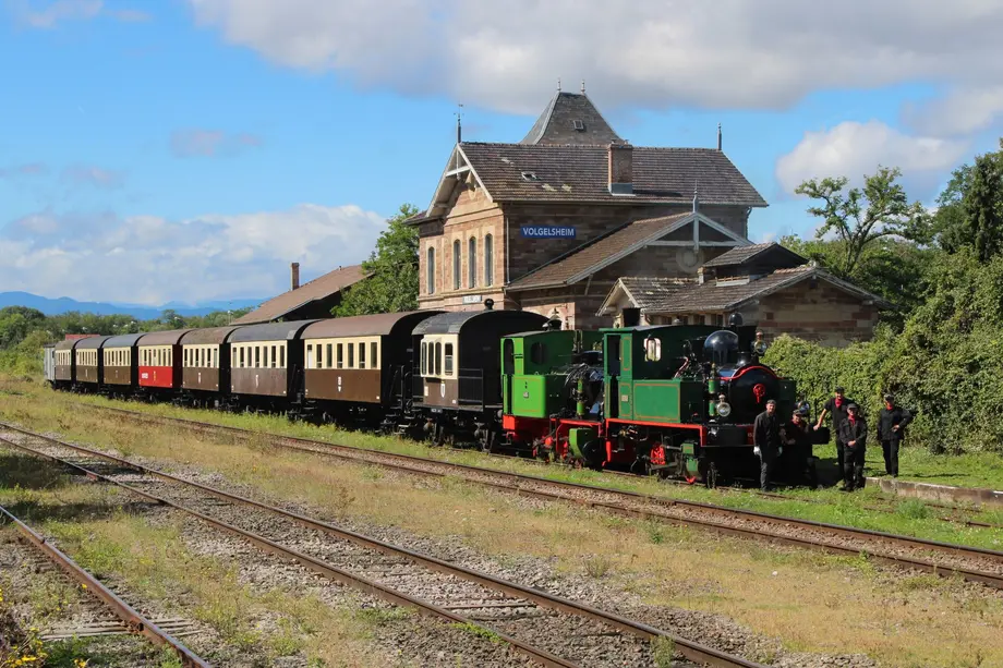 En gare de Volgelsheim : Avant le départ (15h précises), explorez une exposition d’objets ferroviaires anciens. Prenez ensuite place dans une rame à plates-formes ouvertes, datant du début du siècle dernier.