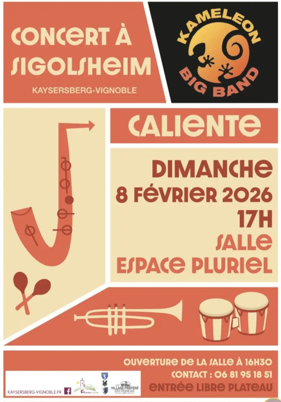 Le Kaméléon Big Band vous accueillera le dimanche 08 février prochain pour son concert annuel avec ce titre "Caliente" qui vous emmènera sur les routes du sud avec des airs de Bossa, Soul, etc... avec des arrangements de Victor Lopez, Henry Mancini, Paul Murtha, Antonio Carlos Jobim, Michel Legrand, Dizzy Gillespie et d'autres surprises.Bien sûr, la rythmique sera bien mise en valeur, les cuivres enchanteurs et les saxophones tout en mélodie, et tout ceci sera magnifié par nos deux chanteurs Élodie et David.