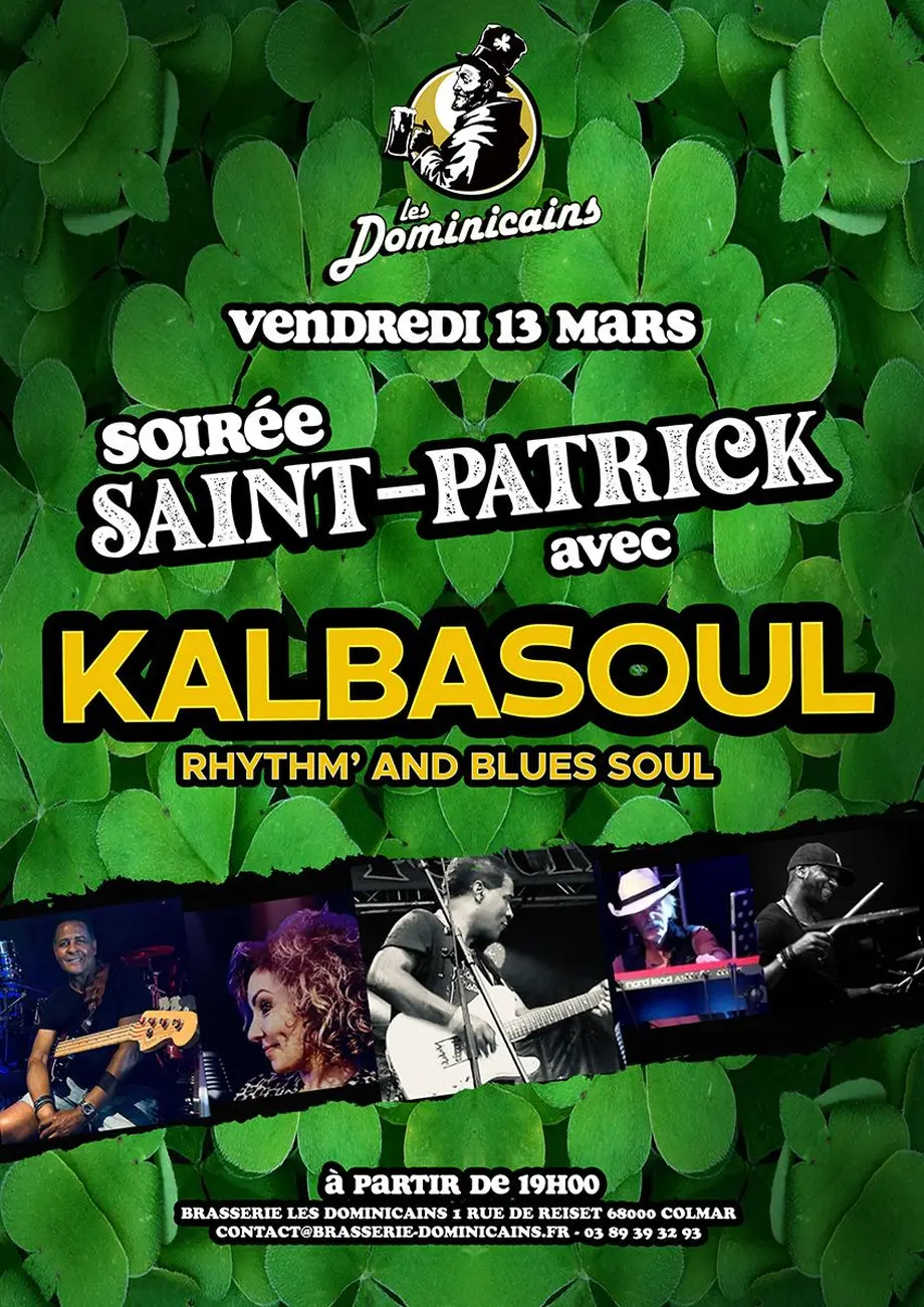 Pour la soirée Saint-Patrick de la Brasserie Les Dominicains, venez passer un moment festif et convivial. Autour de généreuses spécialités alsaciennes et de bonnes bières artisanales brassées localement, profitez de la très bonne compagnie des Kalbasoul. Le groupe colmarien vous fera redécouvrir avec beaucoup de plaisir et de talent, le Rhythm'N'Blues. Ce style musical mélange allègrement le Blues, le Gospel, et le Jazz, au service de compos populaires et accessibles. Ce style contribuera plus tard à l’avènement du Rock And Roll, de la Funk, du Disco, et de toute leur descendance musicale.