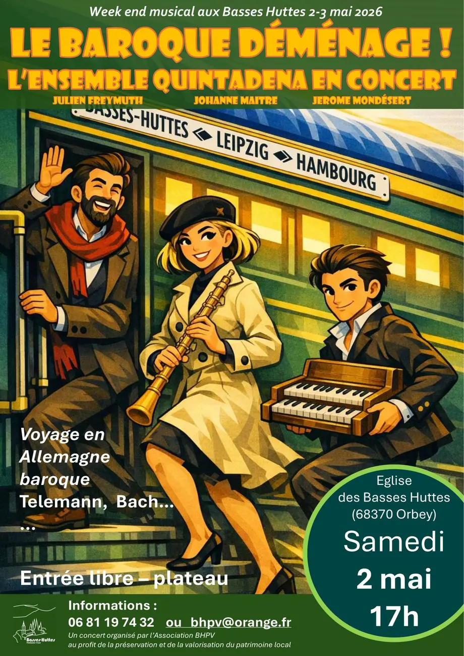 L'Ensemble Quintadena nous offrira un prestigieux concert baroque avec sur scène ses trois grands concertistes alsaciens, Johanne Maitre (hautbois baroque), Julien Freymuth (contre-ténor) et Jérôme Mondésert (clavecin).